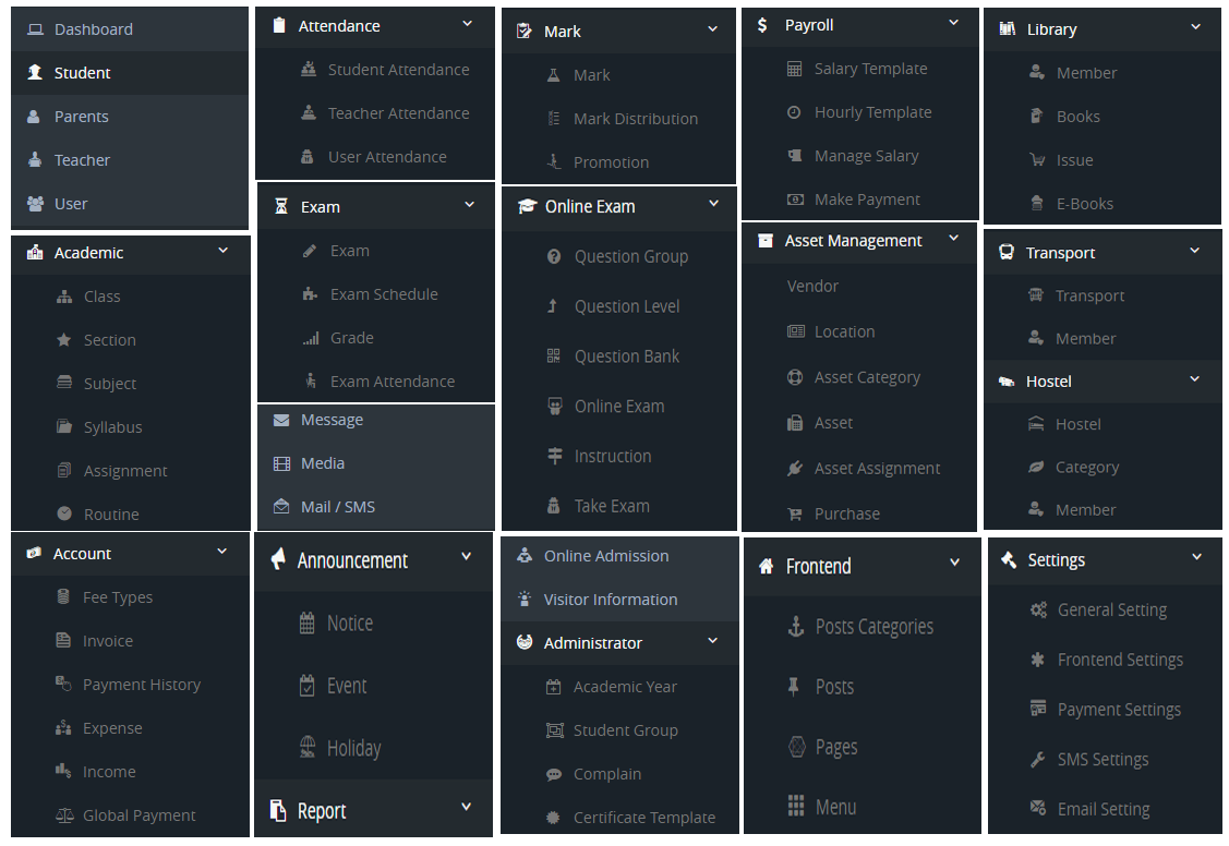 We Provide Most Featured & Trusted School, College, Institutes & Academies management system for Manage your all school work online. We offers the most ever user-friendly school management system, with more than 250+ features, including admission & course management, online exam, attendance & leave management, hostel & transport management, mail & SMS management, More that 8+ online payments & SMS gateway, 100+ reports and many more.